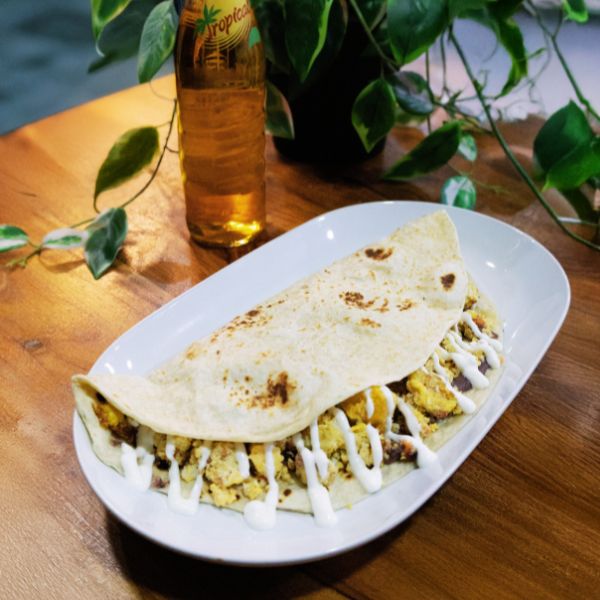 Tortilla de harina, frijoles, mantequilla, huevo con chorizo y queso.