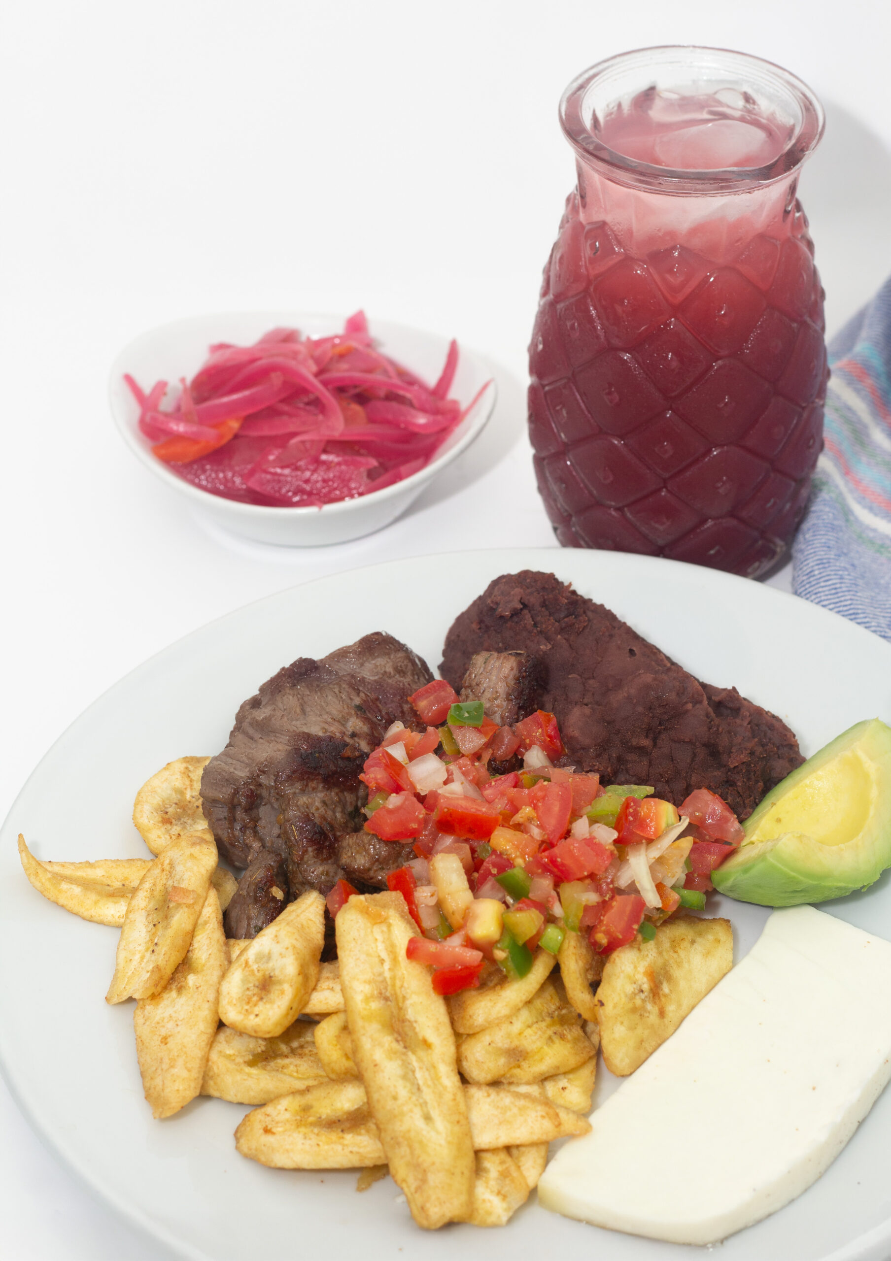 Chuleta , tajadas de guineo verde fritas, repollo, chismol, aderezo y salsa de la casa.