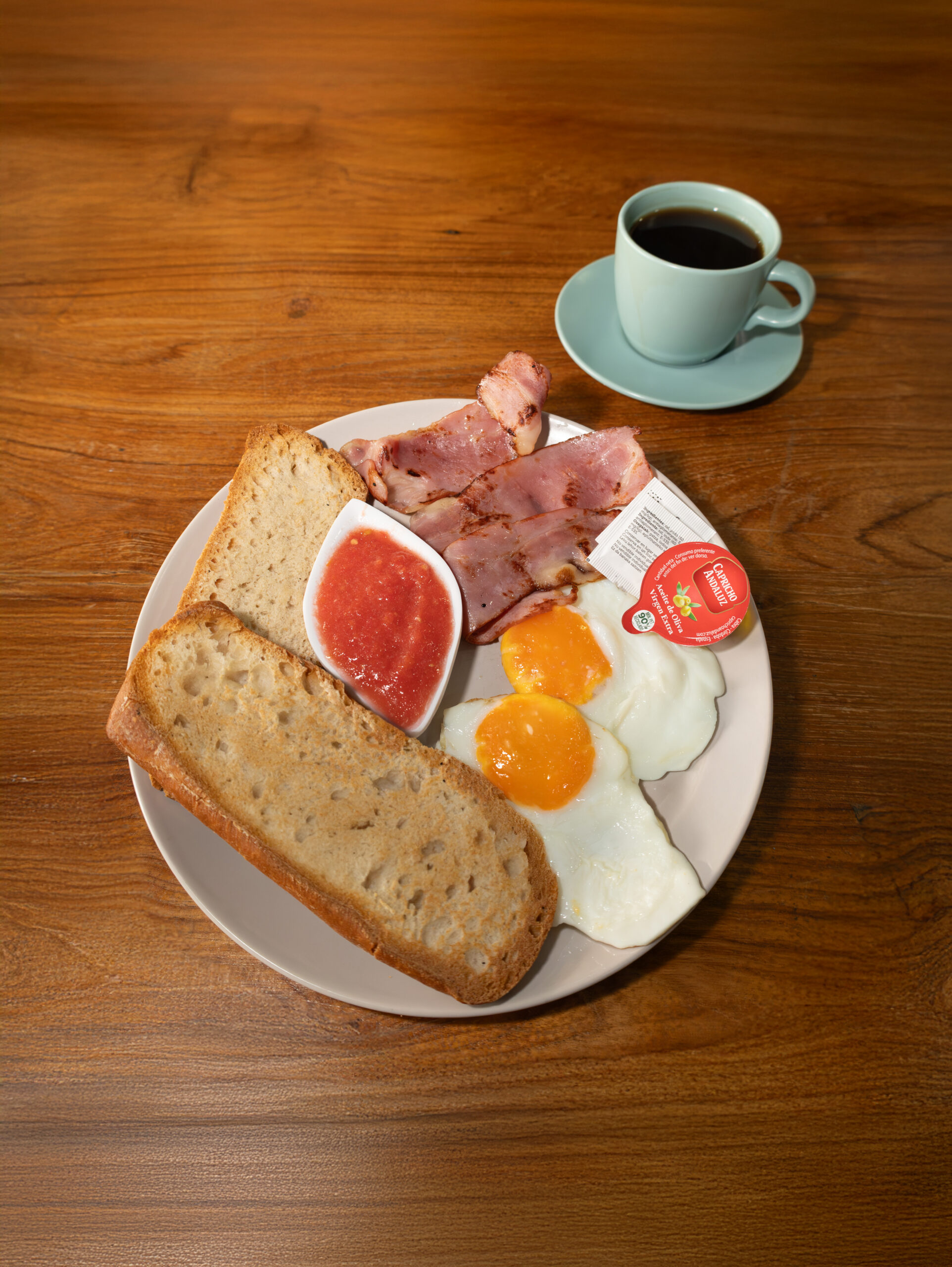 Dos huevos rotos, dos bacón, pan de la casa y café.