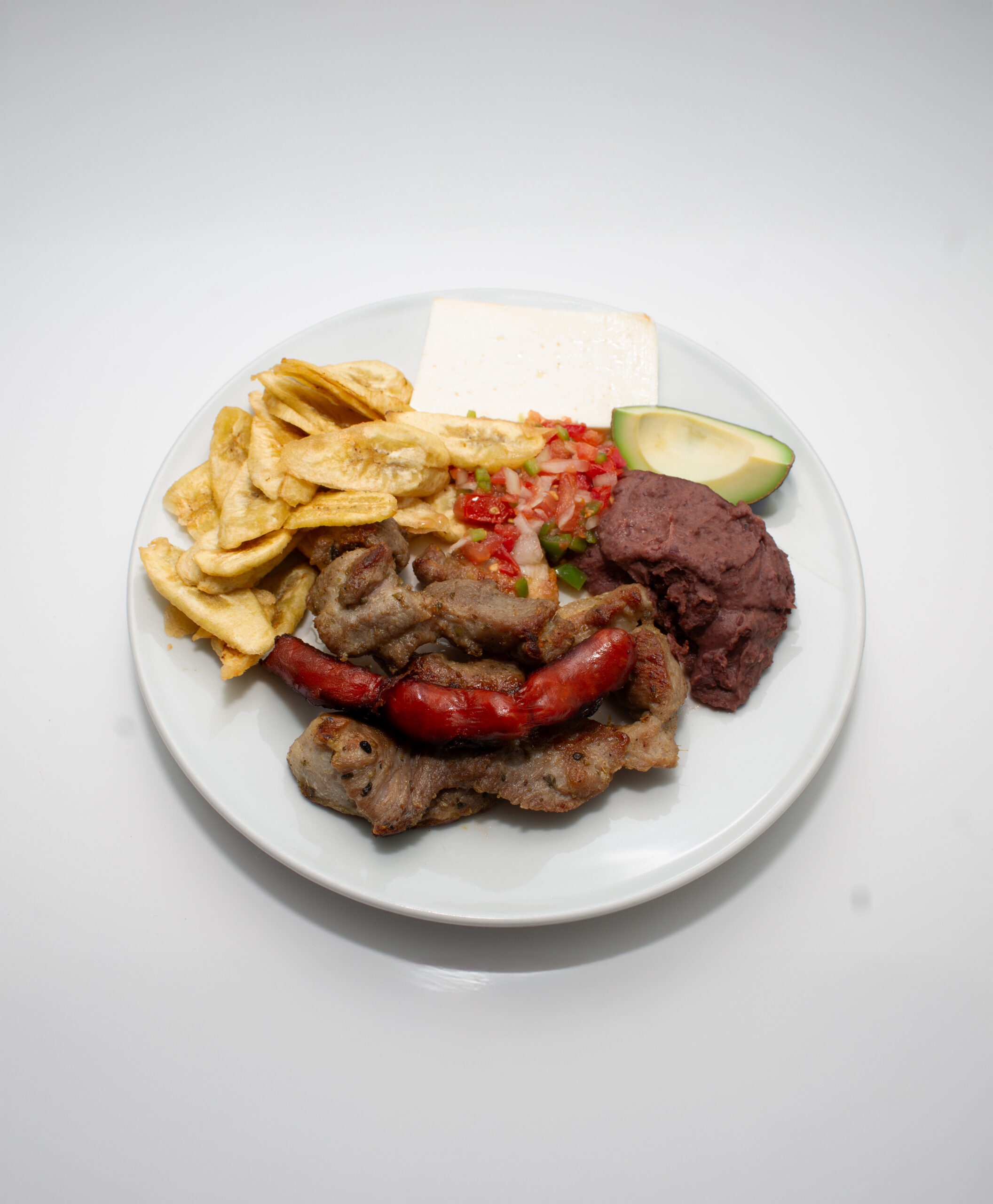 Frijoles , tajadas de guineos fritas, chismol, aguacate, chorizo, queso, carne asada, chimichurri y tortillas de maíz.