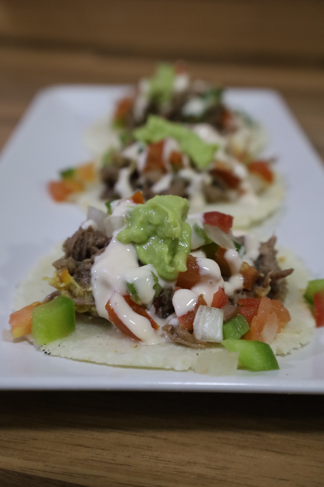 Tortilla de maíz, de pollo, cerdo o ternera, guacamole y chismol.