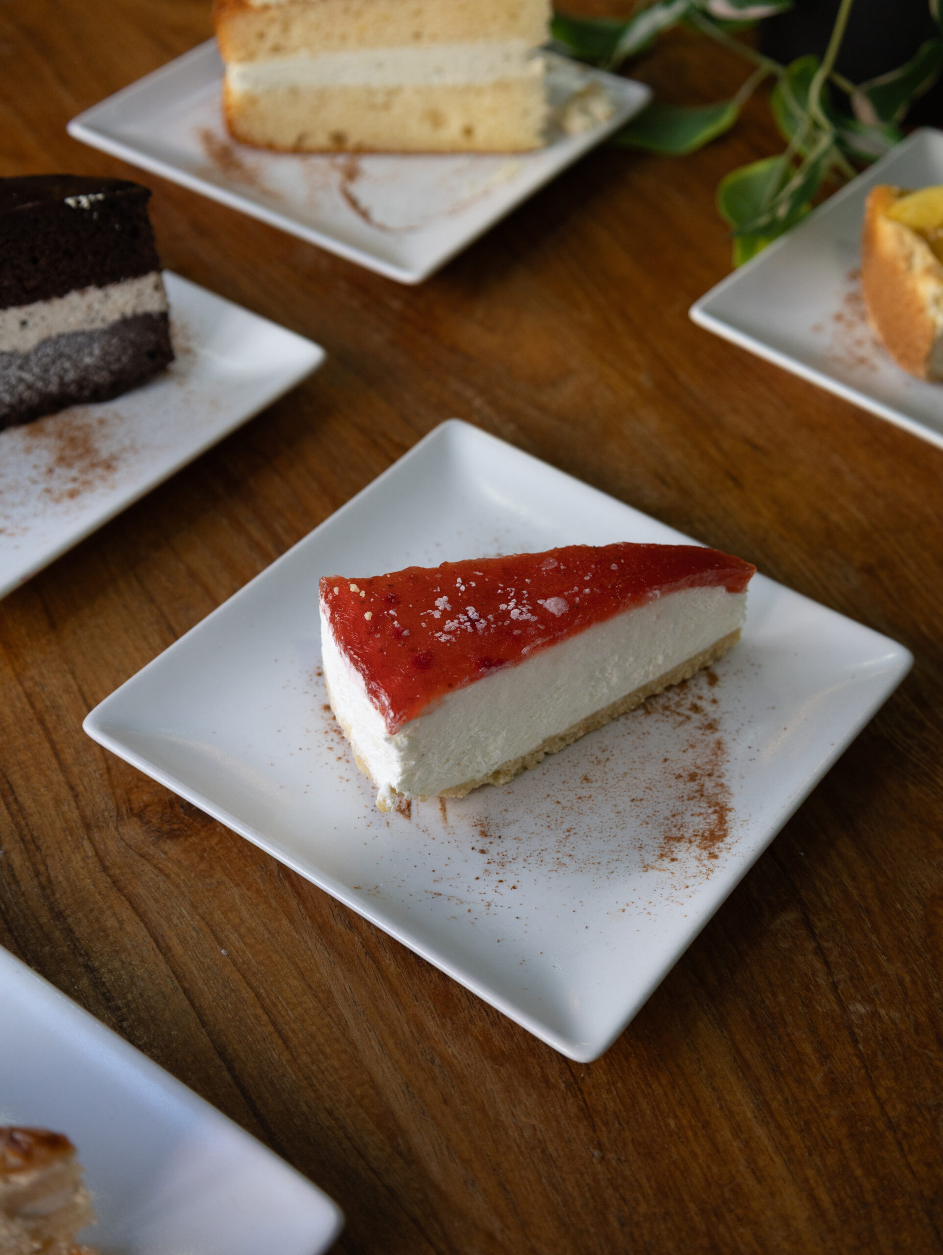 Cremosa tarta horneada de queso a base de queso crema y huevo coronada con auténticos arandanos.
